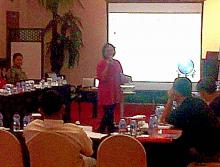 Puluhan petugas konselor adiksi dalam lingkup lembaga rehabilitasi milik BNN dari berbagai daerah, dibekali kemampuan teknis dan pemahaman/pengetahuan seputar konseling adiksi. Narasumber pelatihan, Kasubdit TC Dit PLRIP Ni Made Labasari, Lia, dan Frieda. (DPT)