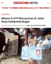 Jelang pelaksanaan tahun-tahun politik, Pilkada Serentak 171 daerah pada Juni 2018, serta Pemilu Bersamaan Pileg dan Pilpres, warga di Jalan Raya Salabenda Desa Parakanjaya Kecamatan Kemang Kabupaten Bogor Jawa Barat, terkejut melihat banyak KTP Elektronik (E-KTP) berserakan dijalanan.