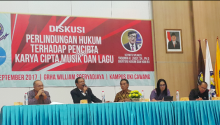 Tema diskusi "Perlindungan Hukum Terhadap Pencipta Karya Cipta Musik dan Lagu". Acara digelar pada Rabu, 20 September 2017, di Auditorium Grha William Soeryadjaya, Gedung Fakultas Kedokteran UKI, Cawang, pukul 09.00-12.00 WIB, menghadirkan 5 (lima) pembicara, yakni: Yasonna H. Laoly, S.H., M. Sc., Ph. D (Menkumham RI, Keynote Speech, diwakili Timbul Sinaga Direktur Sinaga), Dr. Dra. Erni Widyasthari, Apt., M. Sc., (Direktur Hak Cipta & Desain Industri DJKI Kemenkumham RI, diwakili Budi Suratno), Ir. James Freddy Sundah (Artis, Komisioner Lembaga Manajemen Kolektif Nasional), Dahuri, S.E. (Praktisi/ Pemerhati Karya Cipta Musik dan Lagu), dan